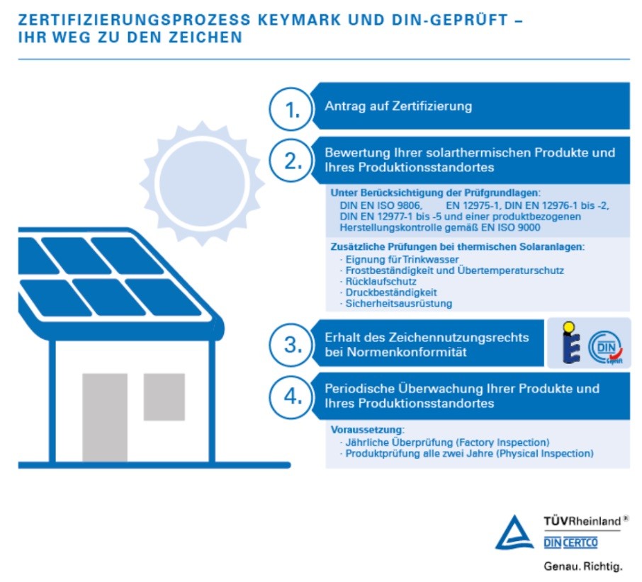 Für die Vergabe der Solar KEYMARK führt DIN CERTCO Prüf- und Überwachungsprozesse durch, die von anerkannten unabhängigen Prüfinstituten unterstützt werden. Neben der Produktprüfung wird auch die Produktionskontrolle vor Ort auditiert, um eine gleichbleibende Qualität zu garantieren. Nach erfolgreicher Zertifizierung wird die Qualität in jährlichen Überwachungsaudits nachgewiesen.